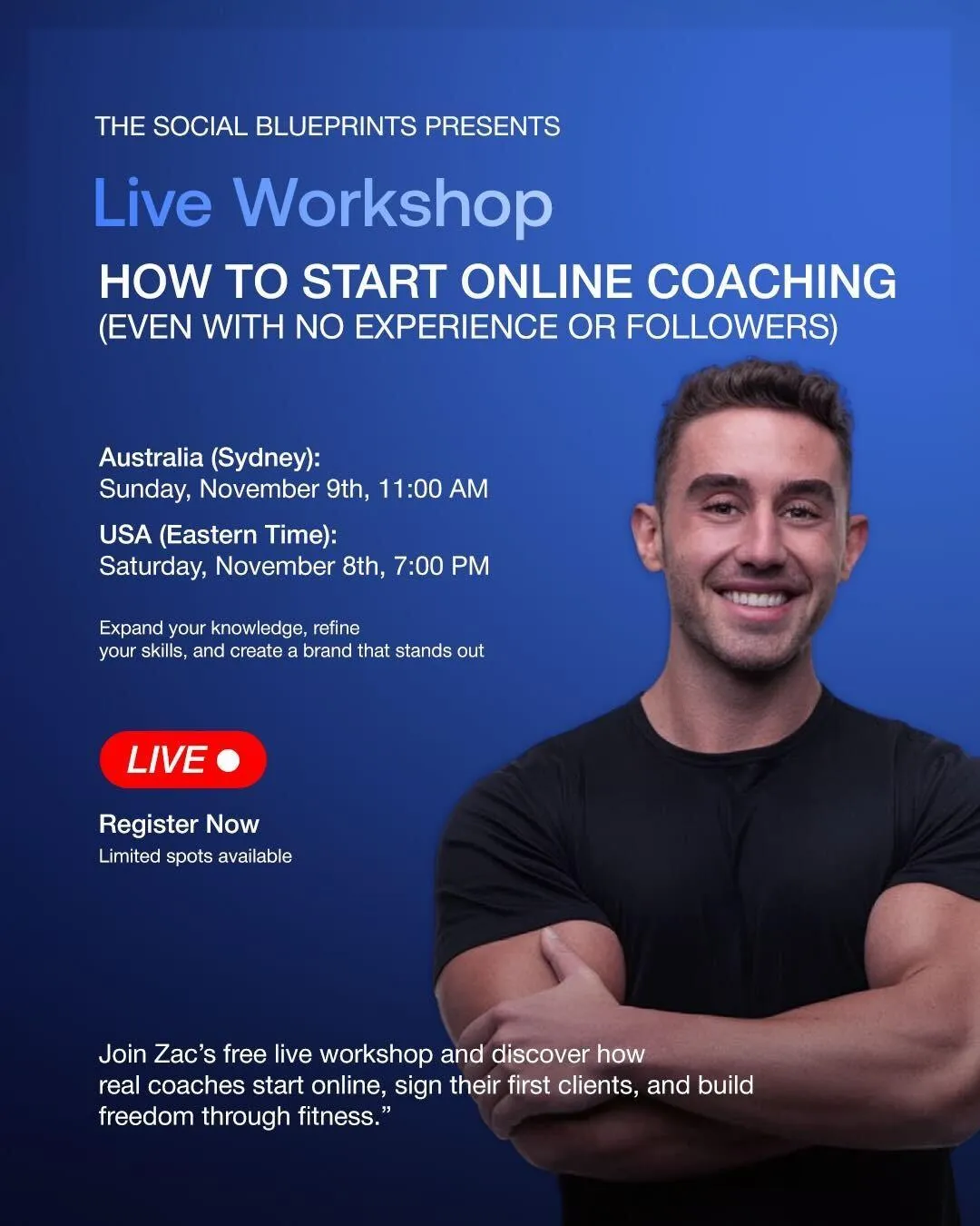 Today, Zac is the founder of The Social Blueprint, a mentorship program designed to help fitness coaches go from side hustle to full-time income.